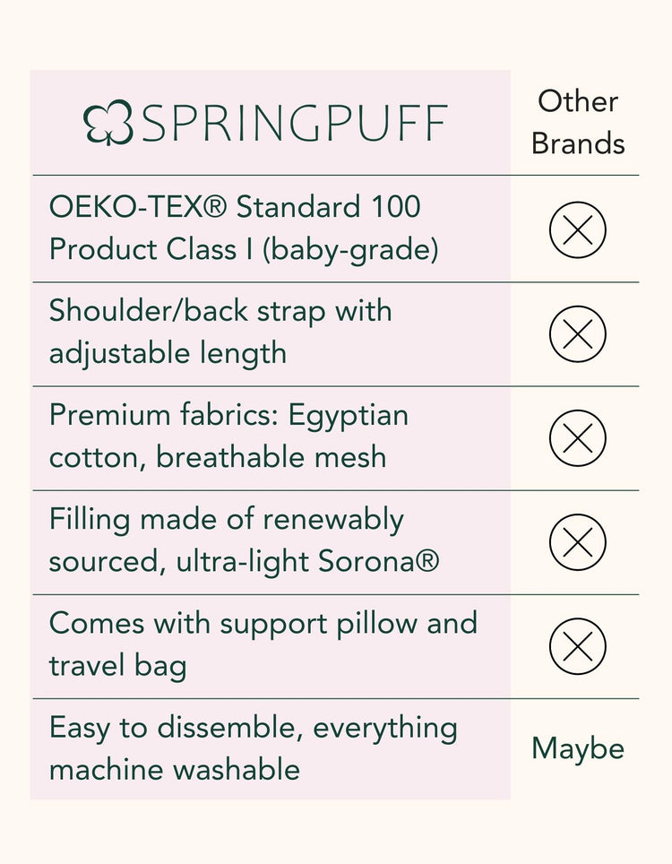 All SPRINGPUFF™ products hold the esteemed OEKO-TEX® Standard 100 Product Class I (baby grade) certification (read more here), ensuring everything is free from harmful chemicals that could compromise you and your baby’s well-being. In addition, all of our products have undergone rigorous testing by worldly recognized organizations, such as SGS and Intertek, delivering the highest level of quality and safety to you and your loved ones.