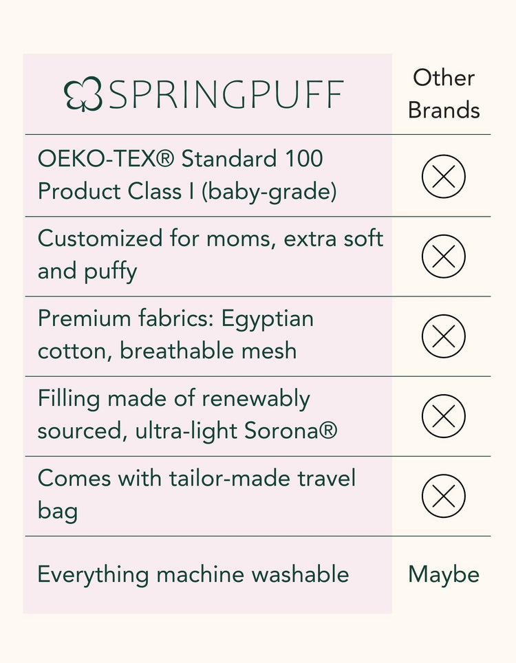 All SPRINGPUFF™ products hold the esteemed OEKO-TEX® Standard 100 Product Class I (baby grade) certification (read more here), ensuring everything is free from harmful chemicals that could compromise you and your baby’s well-being. In addition, all of our products have undergone rigorous testing by worldly recognized organizations, such as SGS and Intertek, delivering the highest level of quality and safety to you and your loved ones.
